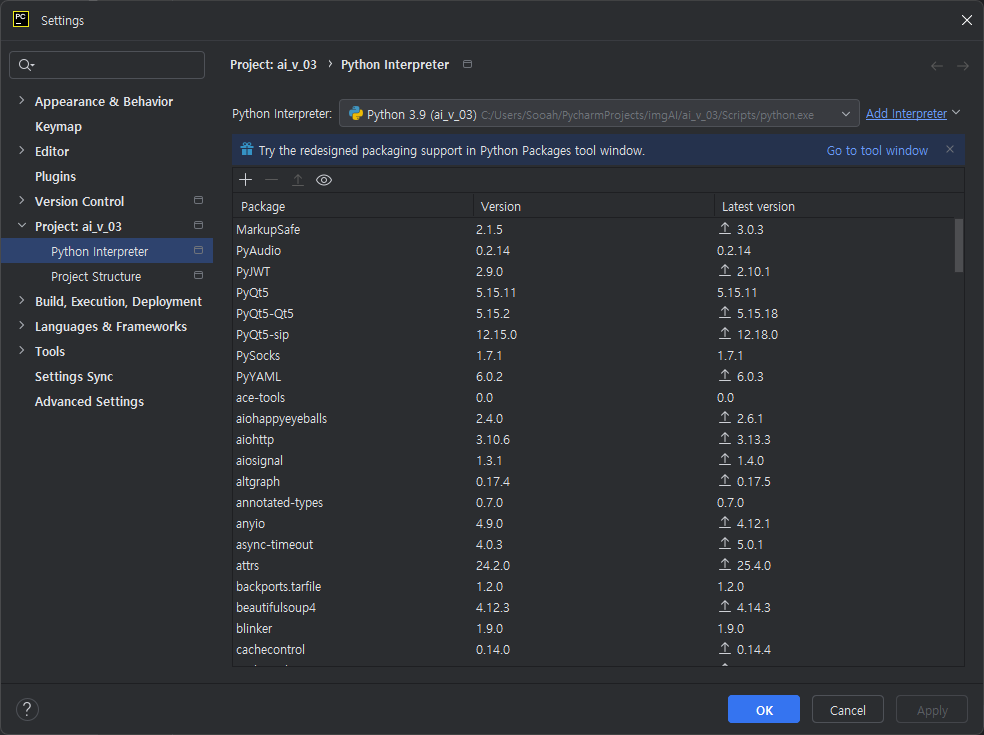 설치한 Python 경로 및 세팅 진행 및 Ok 버튼 클릭