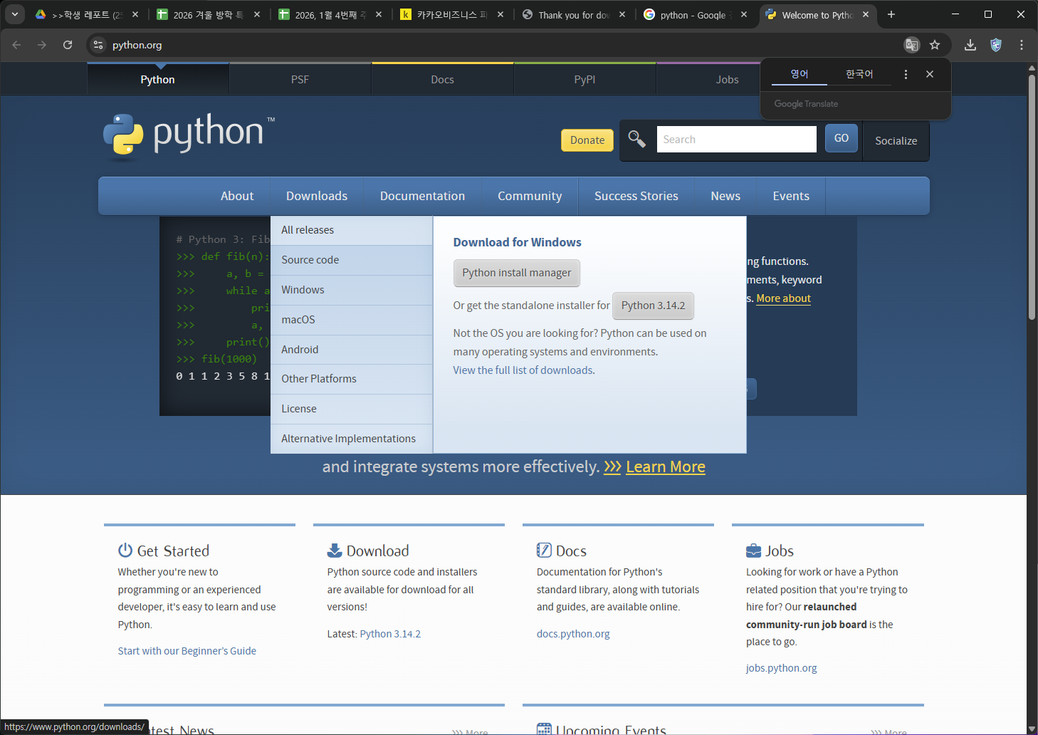 "python" 검색 및 "Welcome to Python.org" 사이트 접속
